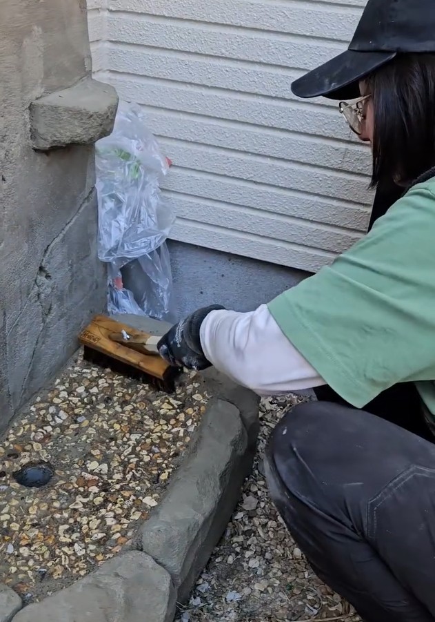 今回の工程では、シンク底面に施工した洗い出し仕上げを整えるため、左官工具を使いながら表面のモルタルを落とし、内部の骨材を浮かび上がらせています。
